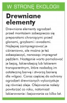 Ogrodzenia metalowe. Tradycyjne siatki stalowe mocowane do metalowych słupków są dzisiaj wypierane przez ogrodzenia z gotowych paneli stalowych albo aluminiowych. To kompletne systemy ogrodzeniowe z gotowych paneli różnej wysokości (od ponad 60 cm do ponad 2 m) i szerokości (2-3 m). Są bardzo trwałe i zapewniają wysoki poziom sztywności. Mocuje się je do stalowych słupków, niekiedy w zestawie są też montowane poprzecznie u góry i u dołu kątowniki. Panele mają nowoczesną prostą stylistykę, w niczym nieprzypominającą tradycyjnej siatki. Paneli nie trzeba już malować. Są wykonywane z ocynkowanych drutów i zabezpieczone antykorozyjnie powłoką PCW. Mają kolorystykę zieloną, antracytową, czarną, białą, można też zamówić pomalowanie ich na dowolny kolor z palety RAL. Także słupy są ocynkowane wewnątrz i na zewnątrz, a następnie pokrywane proszkiem poliestrowym. Do ogrodzenia można dokupić bramy wjazdowe skrzydłowe lub przesuwne, mają one takie samo wypełnienie jak elementy ogrodzenia. Dzięki niewielu koniecznym do montażu akcesoriom taki system jest szybki i nie wymaga profesjonalnego przygotowania. Z elementów drewnianych. Kształt i sposób wykończenia drewnianych elementów jest zazwyczaj bardzo prosty. Wykonuje się je z drewnianych szczebli, żerdek czy poziomo umieszczonych desek (tarcicy). Do budowy ogrodzeń często wykorzystuje się elementy z dość taniego drewna sosnowego, jodłowego, świerkowego, olchowego bądź osikowego. Rzadziej stosuje się droższe drewno jesionowe, wiązowe, akacjowe, dębowe i modrzewiowe, choć jest ono twardsze i odporniejsze na warunki atmosferyczne. Z drewna modrzewiowego wykonuje się często tylko słupki, a elementy wypełnienia są już z drewna niższej jakości. Ogrodzenia można wykonać także z gotowych drewnianych przęseł i paneli. Panele składają się z drewnianej ramy wypełnionej drewnianymi listwami. Wymiary paneli zazwyczaj wynoszą (wysokość, szerokość) 180x180 cm, 180x120 cm, 180x90 cm. Można też kupić panele o mniej typowych wymiarach, np. 150x180 cm, 100x180 cm. Zazwyczaj są wykonane z drewna sosnowego, świerkowego, struganego, najczęściej są zaimpregnowane ciśnieniowo, dzięki czemu nie trzeba ich dodatkowo zabezpieczać, są też bardziej trwałe. Mogą być proste lub zakończone łukowo, pełne, ażurowe tylko u góry lub w całości. Dostępne są także panele żaluzjowe – ich listwy są montowane pod kątem ostrym.