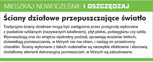 Ściany szkieletowe. Są alternatywą dla ciężkich ścian murowanych. Są od nich o wiele lżejsze, nie obciążają więc tak stropu i można je stawiać praktycznie w dowolnym miejscu. Buduje się je szybko, a wykończone płytami gipsowo-kartonowymi, gipsowo-włóknowymi lub włókno- -cementowymi tworzą gładkie powierzchnie. Konstrukcję takich ścian wykonuje się z profi li (najczęściej stalowych) i obudowuje wyżej wymienionymi płytami. Dla poprawy izolacyjności akustycznej przestrzeń między okładzinami znajdującymi się z obu stron szkieletu ściany wypełnia się szczelnie wełną mineralną. Ściany szkieletowe mogą mieć grubość od 7,5 do 17 cm. Dodatkowym atutem szkieletowych ścian działowych jest ich szybki i łatwy demontaż – w razie konieczności można je więc stosunkowo szybko rozmontować.