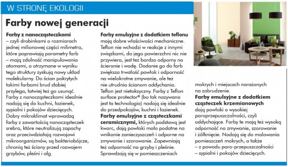 Farby lateksowo-akrylowe. Dają elastyczne powłoki, bardzo odporne na wilgoć i uszkodzenia mechaniczne, nie przepuszczają pary wodnej. Polecane do łazienek i kuchni oraz pokojów dziecięcych.